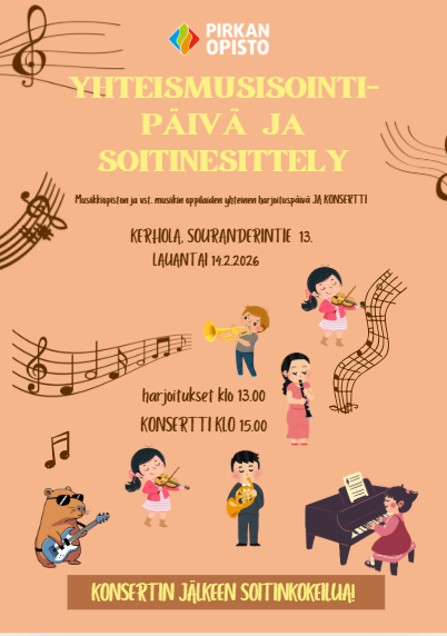 Ilmoittaudu linkistä (13.1. alkaen): Yhteismusisointi ja soitinesittely 14.2.2026 - Pirkan opisto