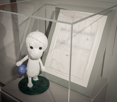Kuva Vuokko Korhosen Ressu-patsaasta ja sarjakuvasta Kuplia ja Ruutuja -näyttelyssä Nokian kirjasto- ja kulttuuritalo Virrassa keväällä 2024.